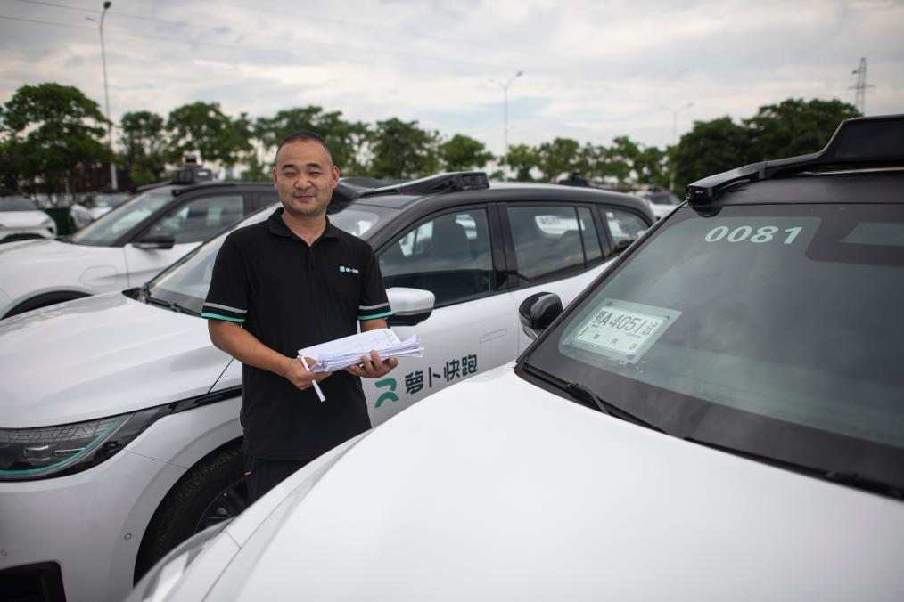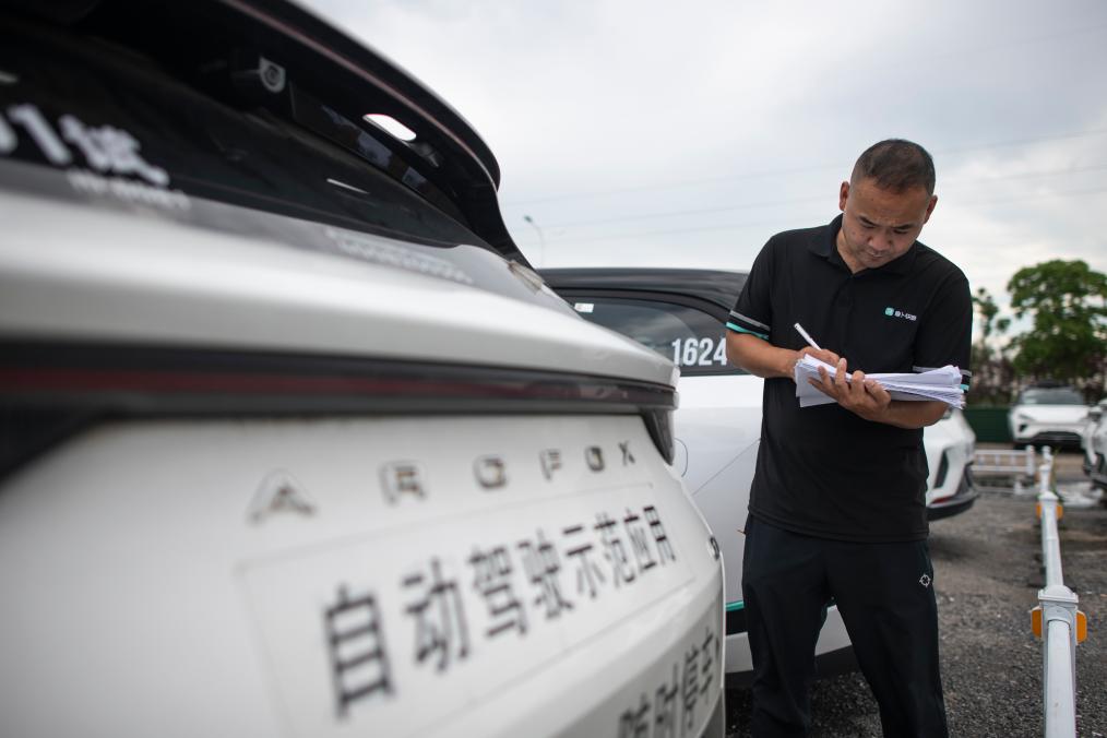 智能网联汽车测试员李成在路测前检查车辆(7月4日摄)。