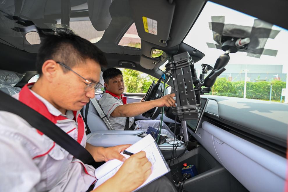 在中汽研汽车检验中心(天津)有限公司,张诚(右)与同事张帅正在一辆智能网联汽车内做测试(6月19日摄)。