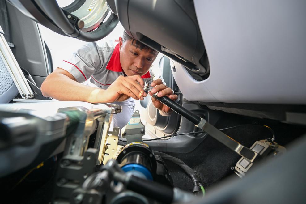 在中汽研汽车检验中心(天津)有限公司,张诚为一辆即将测试的智能网联汽车安装转向机器人(6月19日摄)。