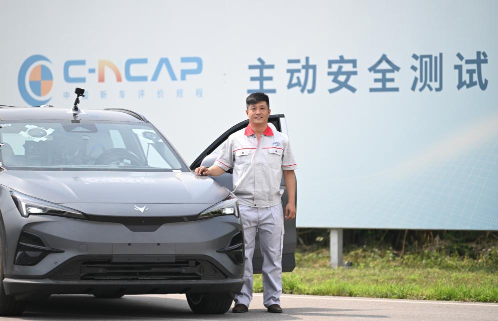 在中汽研汽车检验中心(天津)有限公司,一辆智能网联汽车在测试场内进行主动安全自动紧急制动测试(6月19日摄)。