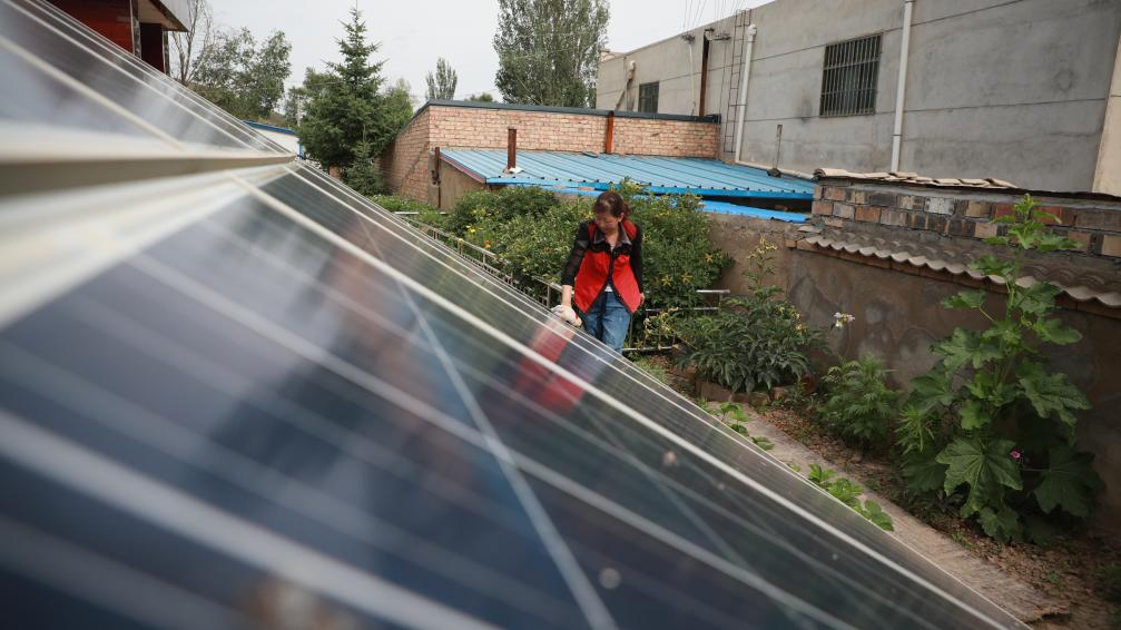 通渭县油坊村村民全小萍正在擦拭自己家中的光伏板。新华社记者 张睿 摄