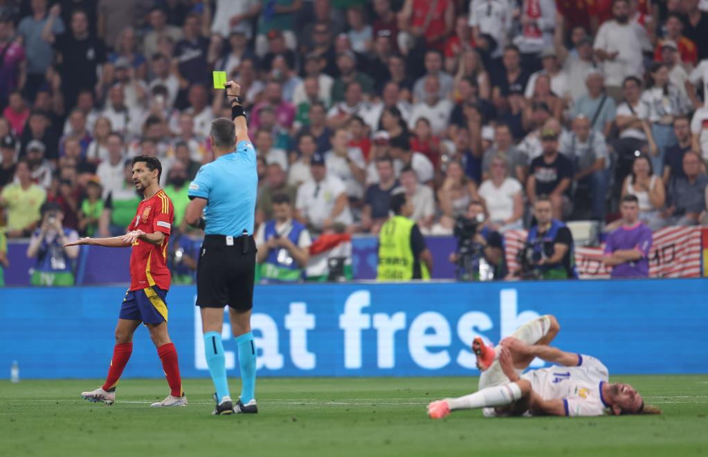 7月9日,主裁判斯拉夫科·温契奇(左二)向西班牙队球员赫苏斯·纳瓦斯(左一)出示黄牌。当日,在德国慕尼黑进行的2024年欧洲足球锦标赛半决赛中,西班牙队2比1战胜法国队,晋级决赛。 新华社记者 白雪飞 摄