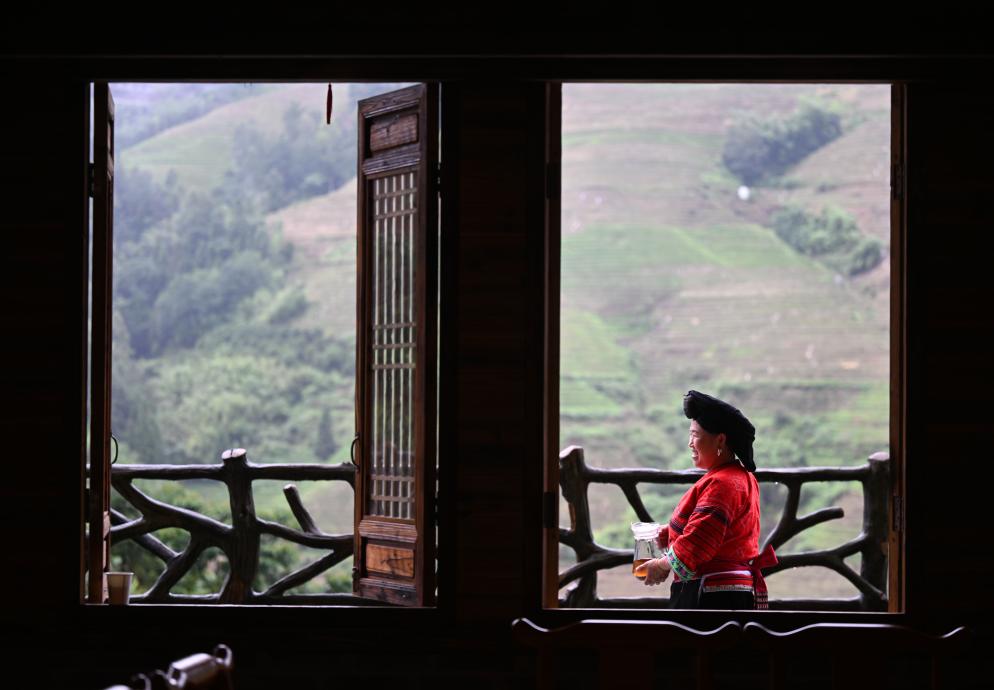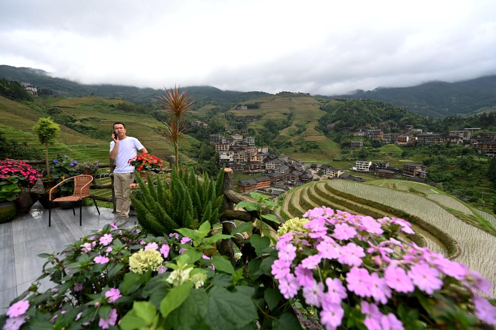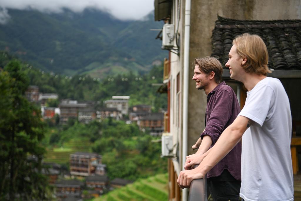 来自德国的游客在大寨村的一家民宿赏景(6月26日摄)。