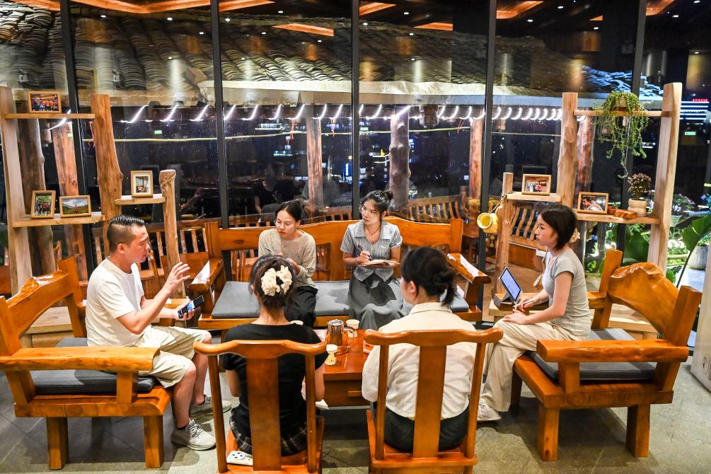 7月10日,在大寨村“山中已千年”观景民宿,民宿负责人余琼通(左一)与今年刚招聘来的大学毕业生交流。