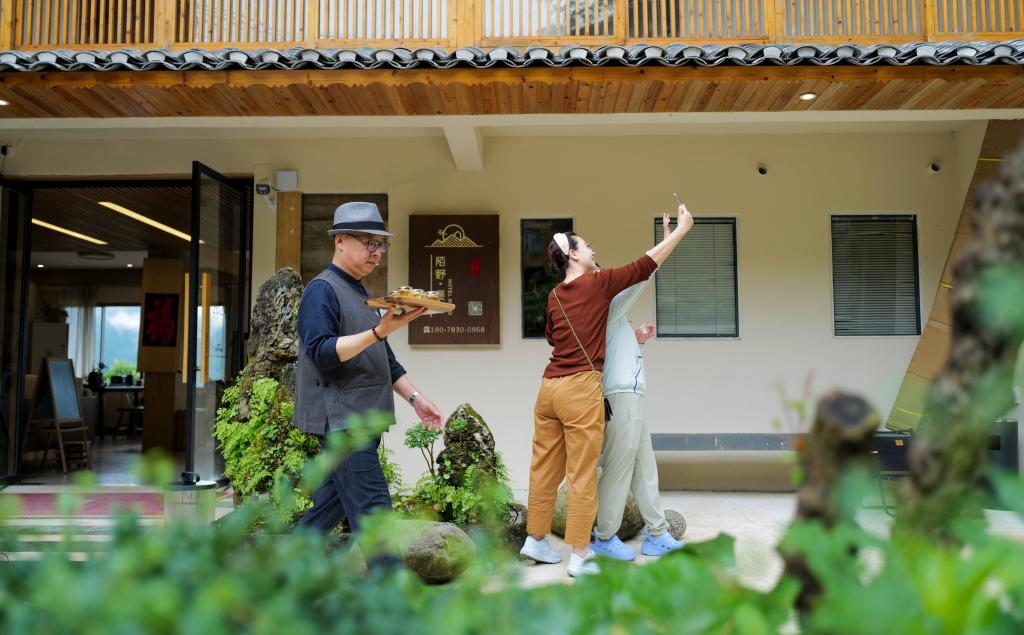 7月11日,在大寨村“山中已千年”观景民宿,两名刚毕业的大学生应聘到此工作,为游客拍照。