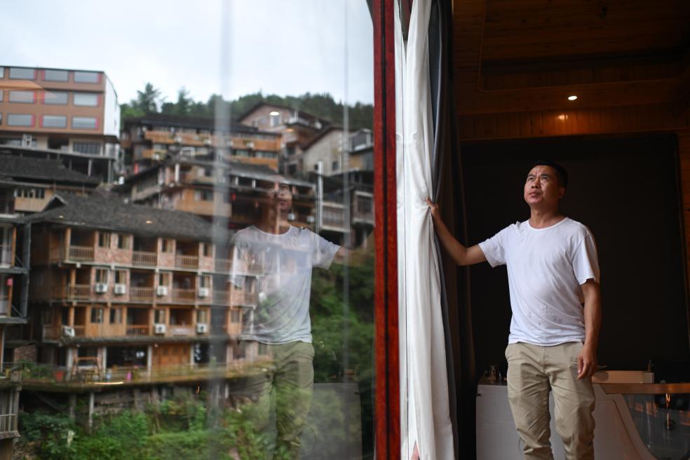 6月27日,大寨村“山中已千年”观景民宿的负责人余琼通在民宿观景平台联系业务。