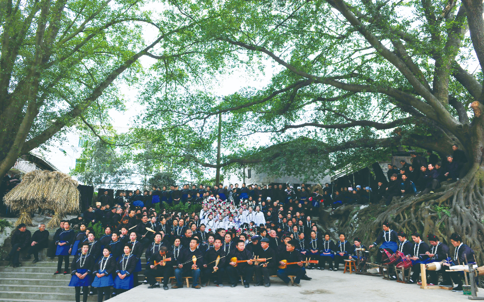 乐乡侗寨的古榕树下,400余名男女歌手汇聚一堂,歌唱着流传了几百年的侗家牛腿琴歌。新华社发(吴江平 摄)