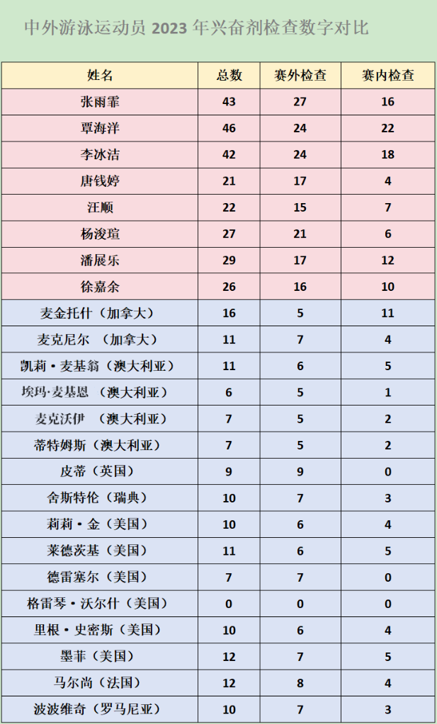 在今年2月多哈游泳世锦赛上改写男子100米自由泳世界纪录的潘展乐去年共有29次兴奋剂检查,包括17次赛外、12次赛内。美国奥运冠军德雷塞尔去年只接受了7次检查,全部是赛外;前世界纪录保持者、罗马尼亚的波波维奇去年共接受了10次检查;澳大利亚“飞鱼”麦克沃伊的次数为7次。