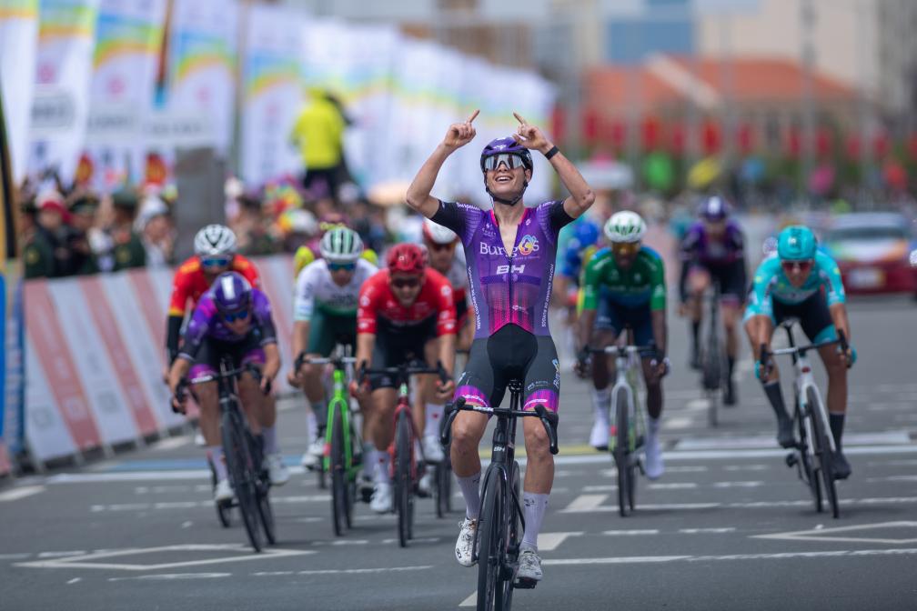 7月14日,西班牙布尔戈斯BH车队车手法贡德斯(前)在冲过终点线后庆祝。新华社发(潘彬彬摄)