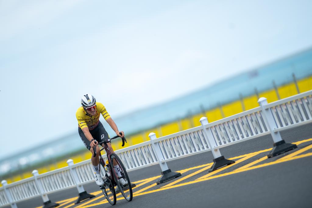 7月11日,比利时塔特雷托-艾索雷斯车队车手阿恩·桑蒂在比赛中骑行。新华社发(潘彬彬摄)
