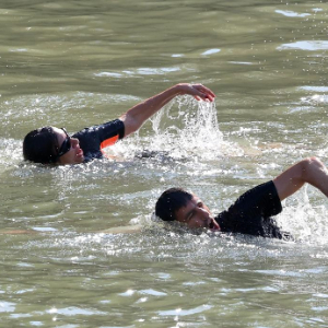 7月17日,巴黎市长伊达尔戈(左)、巴黎奥组委主席埃斯坦盖在塞纳河中游泳。新华社记者 曹灿 摄