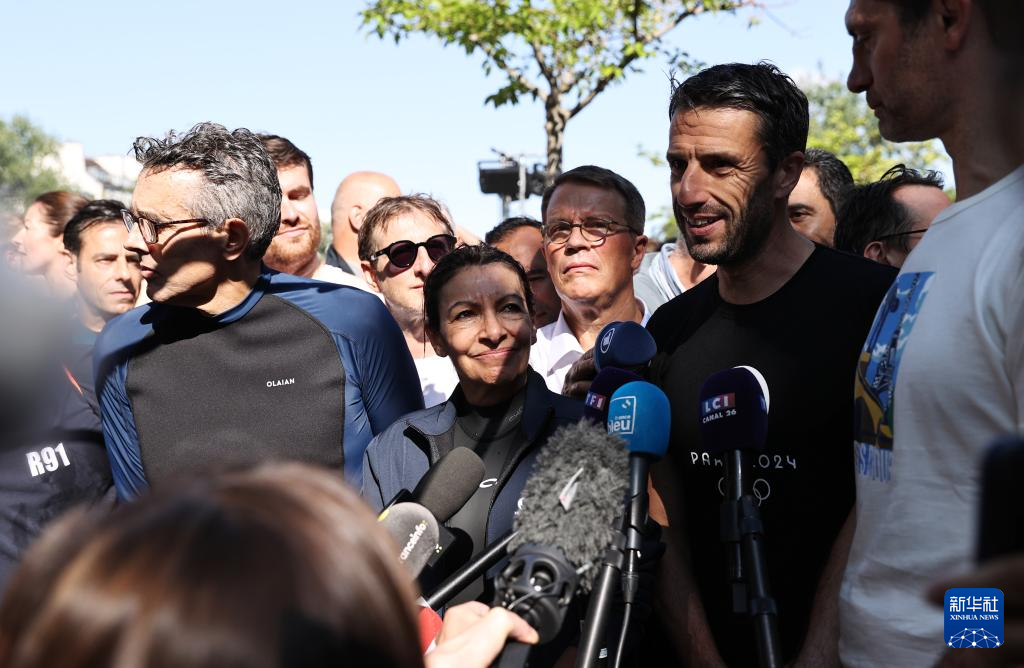 7月17日,巴黎市长伊达尔戈(中)和巴黎奥组委主席埃斯坦盖(前右二)游泳后接受媒体采访。新华社记者 高静 摄