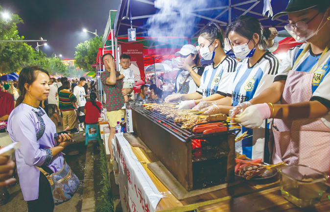 每当周末的球赛过后,往往已是深夜。行走在榕江县城,徐徐晚风从都柳江沿岸吹来,城中不少餐饮店依然热闹非凡,游客们在观赛结束后三五成群围上一桌,忙了小摊小贩,乐了外地游客,富了本地群众,成了榕江夜生活、夜经济的日常写照。