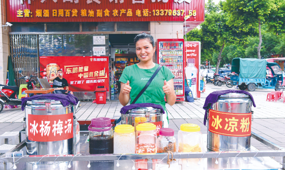 在球场外卖杨梅汤的石进芬,在村超决赛当天挣了近1500元。图片来自贵州画报社 (林剑 摄)