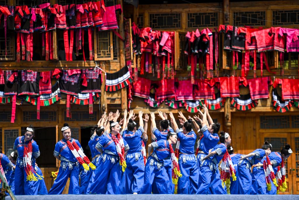 在广西龙胜各族自治县龙脊镇大寨村,群众在表演传统民族舞蹈。新华社记者 曹祎铭 摄
