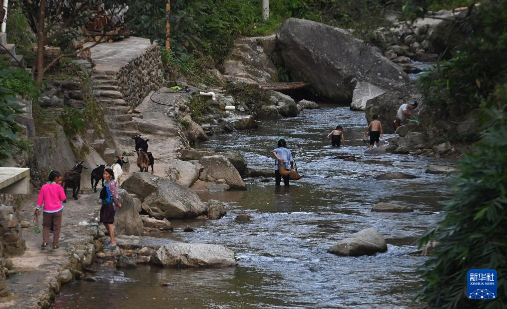 乌英屯村民放羊归来在河边交流(2024年7月12日摄)。