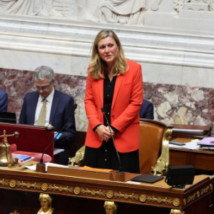 7月18日,在位于法国巴黎的国民议会,“复兴党”议员娅埃尔·布朗-皮韦连任议长后发表讲话。新华社发(亨利·施瓦茨摄)
