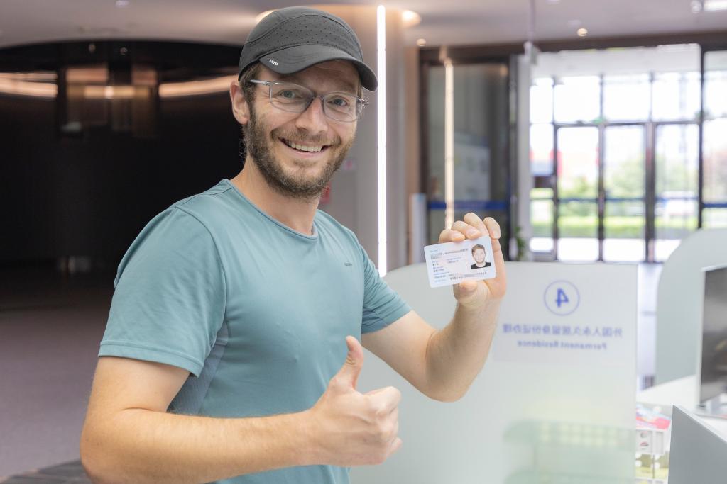 7月9日,在重庆市公安局出入境管理局移民事务服务中心,外籍人员展示刚申领到的“五星卡”。新华社记者 黄伟 摄