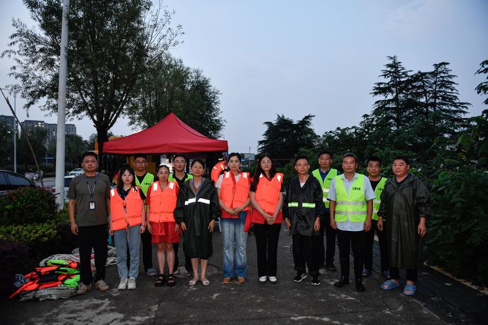 7月18日,吕怀义(右一)在唐河岸边与值守的部分工作人员合影。新华社记者 吴刚 摄