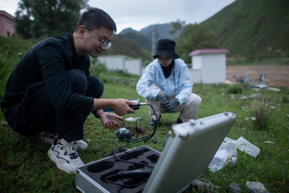 7月20日,在直门达水文站,长江科学院空间信息技术应用研究所廖茂昕(左)和付珺琳进行土壤多参数检测。新华社记者 伍志尊 摄