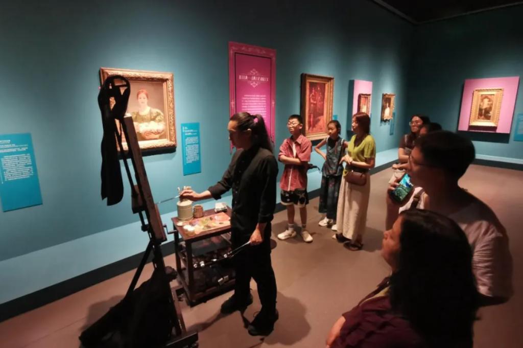 活动现场,青年艺术家十也正在认真临摹这幅世界名画。“临摹的过程也是重温画家当年创作的过程。”十也说,佩鲁吉尼对于人物神情的把控游刃有余,尤其是头部描绘,比如《芍药》这张画中的女子,她眼目低垂,若有所思,这是一种“向内”的心绪设计。侧顶光照射下,人物脸庞立体精致,明暗肤色也都处理得通透温润,再配以金棕色的秀发与简洁的珍珠发饰,尽显高贵典雅,这也是临摹这张画时最难还原与把控的部分。