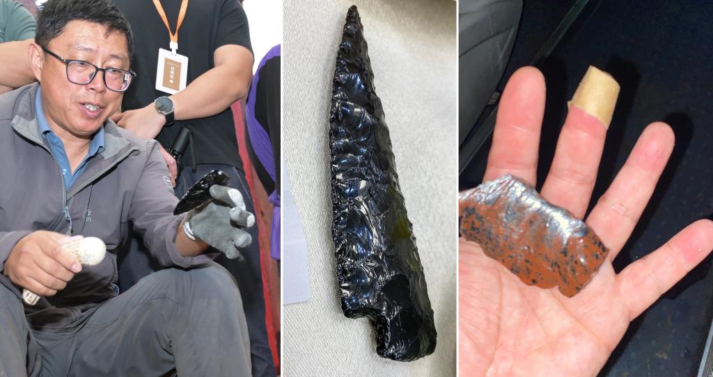 中国科学院古脊椎动物与古人类研究所高级工程师陈友福在现场为参观者演示将一块黑曜石坯打制成一件可以用作狩猎使用的石矛(左);一件由专家采用古法以黑曜石打制出来的狩猎石矛(中);在观赏一件剥离下来的石叶片时,记者的手指不慎被锋利的刃部划伤(右)(2023年7月30日摄)。