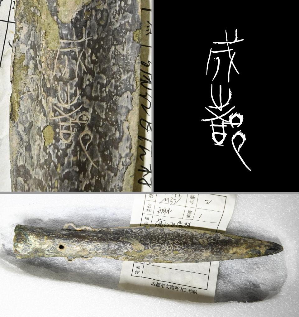 在成都蒲江县大型船棺墓群发掘出土的带有“成都”刻字的铜矛(下);“成都”矛刻字局部(上左);经描摹出的“成都”字样(上右)(2017年3月1日摄)。