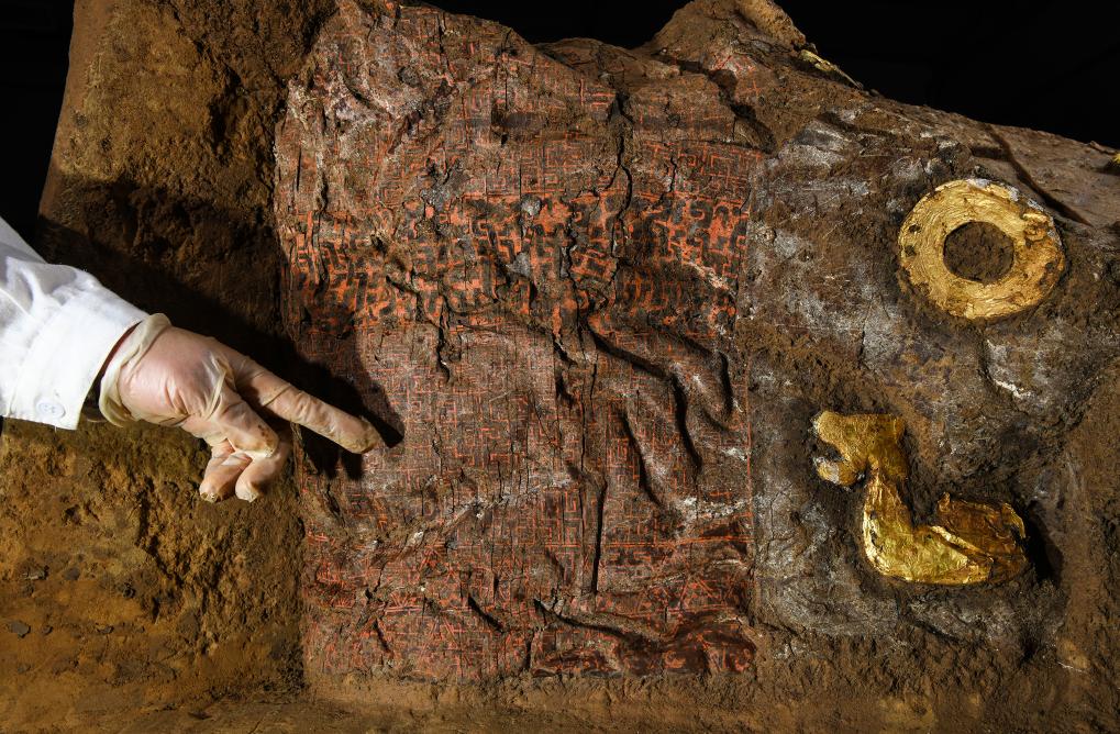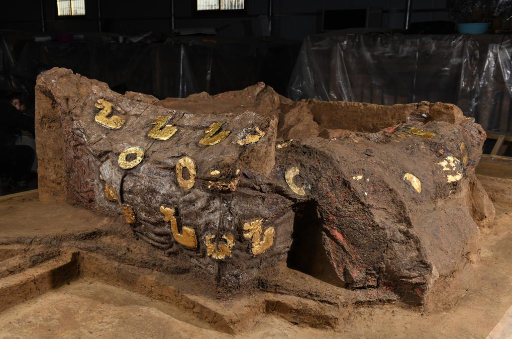 这难不倒经验丰富的科技考古工作者。他们提前拟定了提取方案……当车轮被成功揭取后,车厢部分展露无遗。尤其是车厢的四面立板,不仅以繁缛的髹漆彩绘图案装饰,还镶嵌着若干贴有金箔饰片的金属兽形牌饰,庄严大气富丽堂皇。不难想见,乘坐如此座驾穿行于街市,那是何等的威风。
