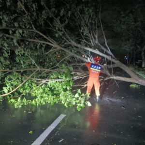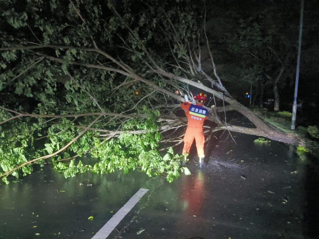 受台风影响,海南多地树木被强风吹倒,导致交通堵塞,消防救援人员及时处置。(海南省消防部门供图)