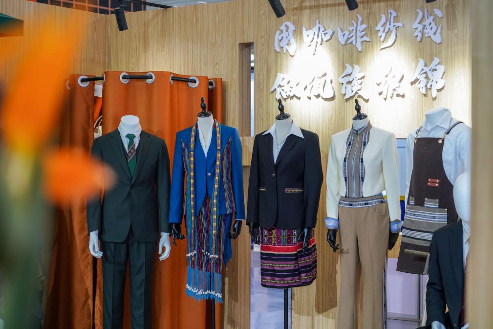 7月23日,在第八届中国—南亚博览会咖啡产业馆的西盟佤族自治县织锦服饰展区,纺织原料取材自咖啡渣的佤族织锦服饰正在展示。新华社记者王静颐 摄