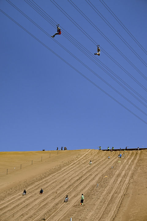 7月5日,游客在中卫市沙坡头旅游景区体验黄河飞索和滑沙项目。