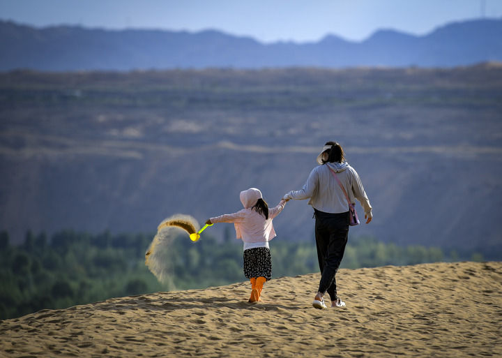 在滑沙区,大人孩子乘滑沙板从70多米高的沙丘上滑下,欢笑与尖叫此起彼伏。吴泉一家专程从江苏南通来到这里,在沙漠中待了3天,入住了“世界上最孤独的酒店”——建在沙海中的星星酒店。“老家见不到沙漠,孩子们在这里玩得很开心,住宿体验也很好。一到沙漠,感觉整个人都自由了。”