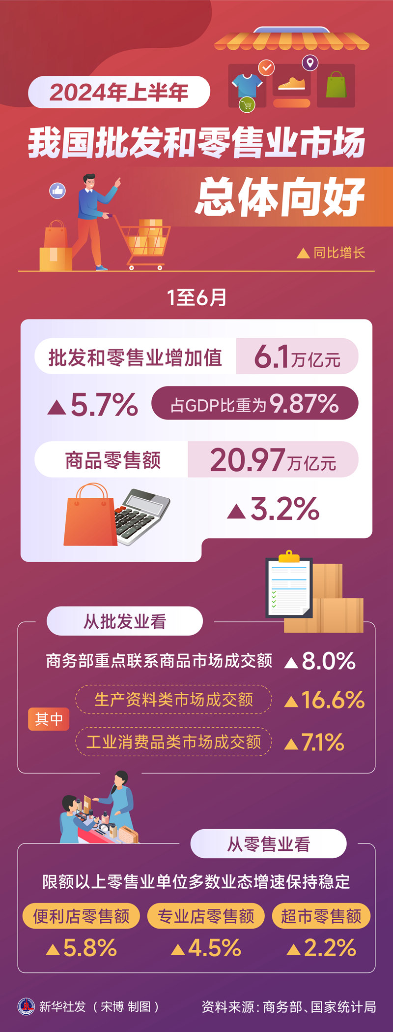 新华社北京7月23日电(记者谢希瑶)商务部流通发展司负责人23日介绍,上半年我国批发和零售业市场总体向好,多数业态稳定增长。