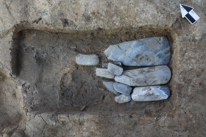 这是2023年3月14日拍摄的四川省广汉市三星堆遗址发掘区的石斧坑第四层。新华社发(四川省文物考古研究院供图)