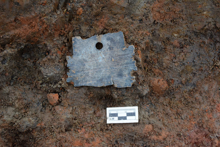 这是2023年4月24日拍摄的四川省广汉市三星堆遗址发掘区出土的玉璋。新华社发(四川省文物考古研究院供图)