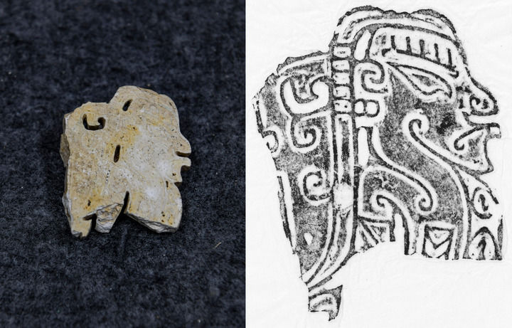 拼板照片:左图是2024年7月10日在四川省文物考古研究院拍摄的玉石上阳刻的侧身人像(新华社记者王曦摄);右图是玉石上阳刻的侧身人像拓片(新华社发 四川省文物考古研究院供图)。新华社发