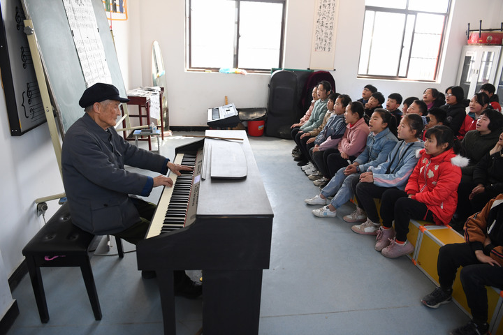 2021年3月23日,严明友在安徽省滁州市定远县朱湾小学教室里给孩子们上音乐课。新华社记者 刘军喜 摄