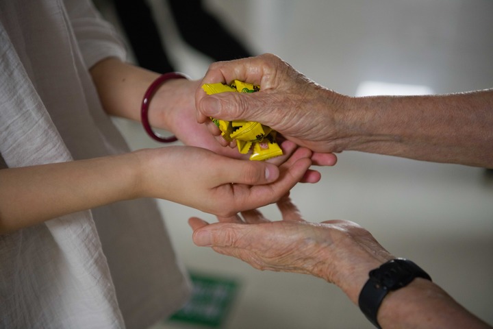 2024年7月18日下午,郁晓楠回合肥之前,严明友老人(右)抓了一把糖送给她。新华社记者 张端 摄