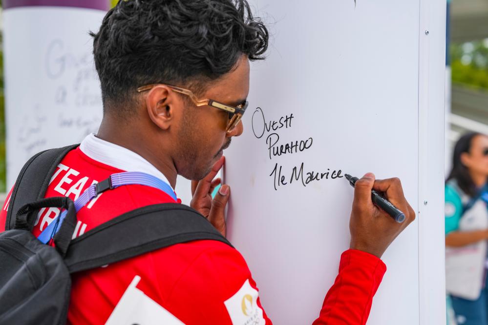 7月22日,毛里求斯运动员普拉霍在休战墙上签字。新华社记者 孙非 摄