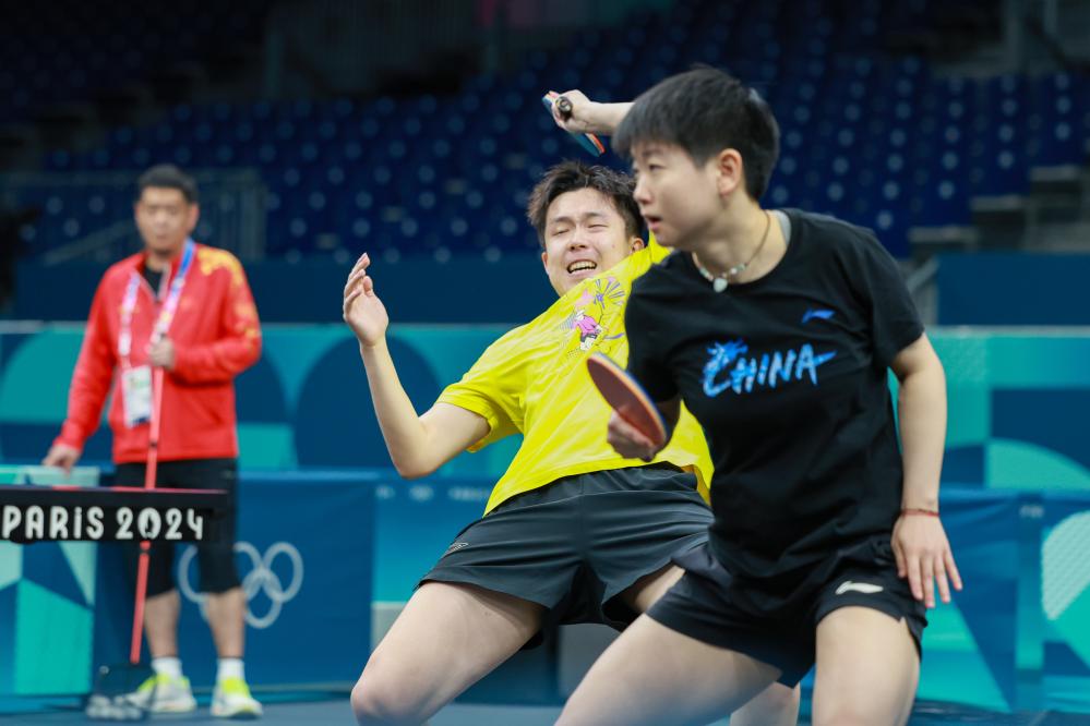 7月24日,中国队组合王楚钦(中)/孙颖莎(右)在训练中。新华社记者 刘续 摄
