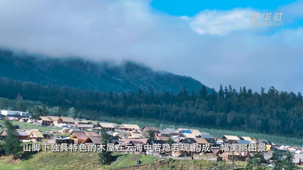 一场雨后,新疆阿勒泰白哈巴村出现云海景观。天空中云雾缭绕,仿佛一层薄纱覆盖着广袤的草原,山脚下独具特色的木屋在云海中若隐若现,构成一幅美丽图景。