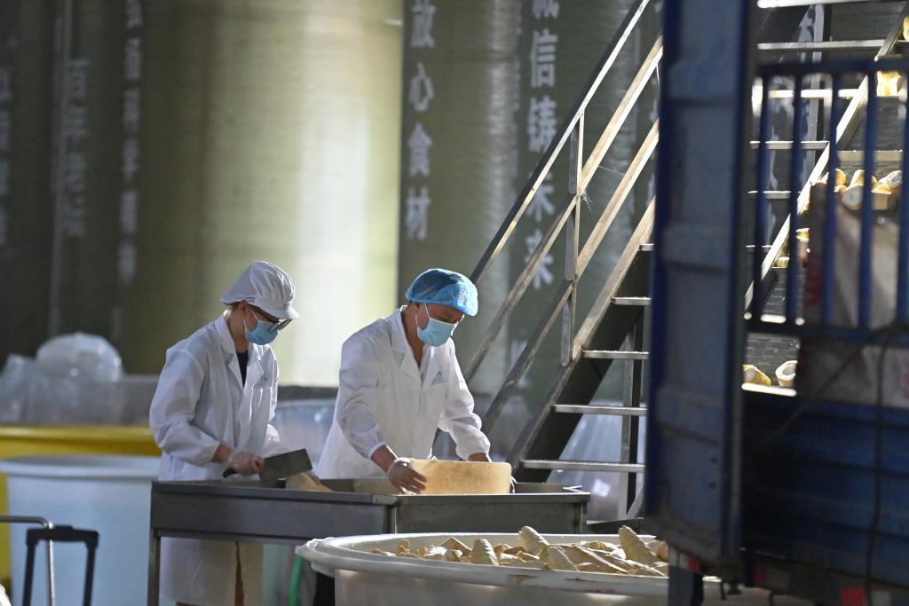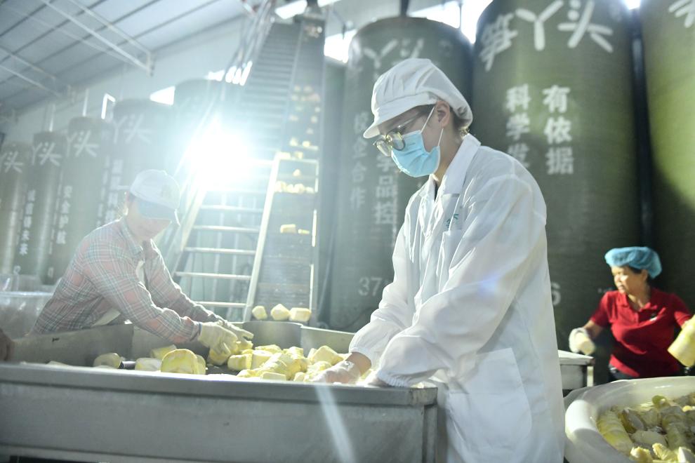颜茜茜(中)在酸笋加工厂生产线上加工竹笋(7月23日摄)。