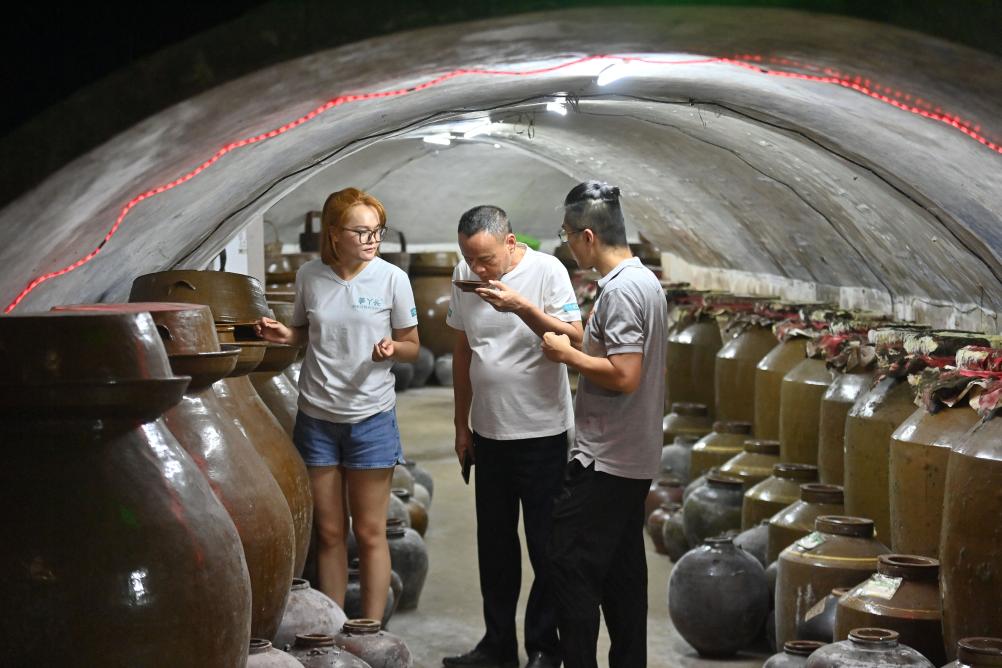 颜茜茜(中)和父亲颜建条(左)、广西科技大学生物与化学工程学院博士玉万国在公司酸笋水菌种库研究酸笋发酵情况(7月24日摄)。