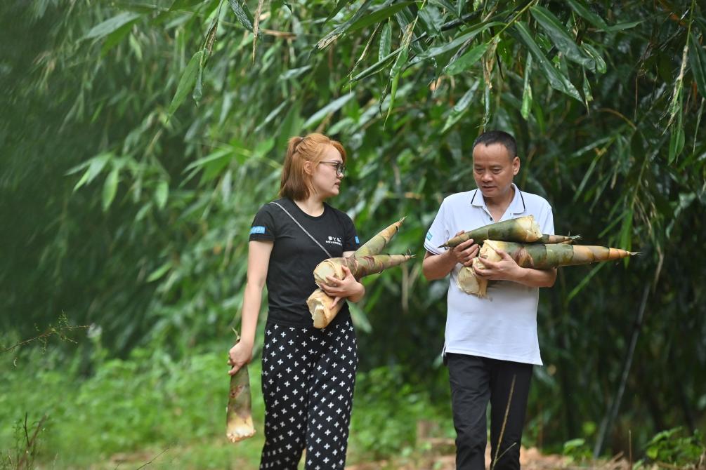 颜茜茜(左)和父亲颜建条在竹笋种植基地采收竹笋(7月23日摄)。