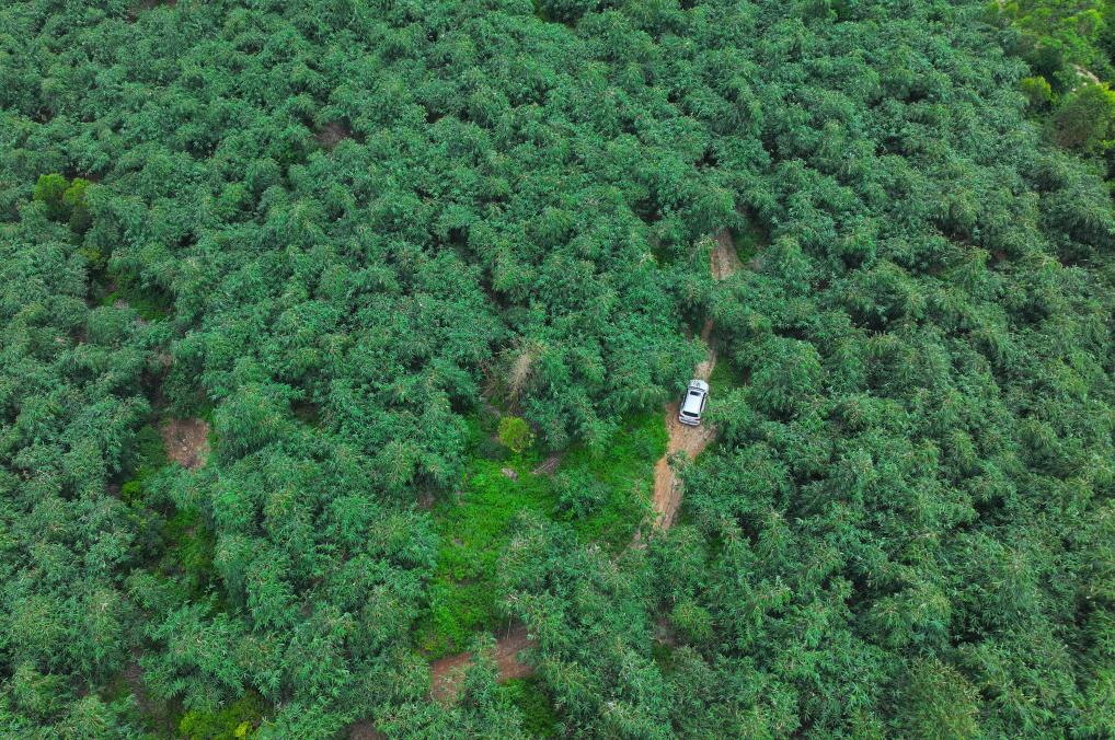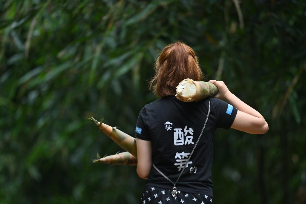 颜茜茜驾车来到竹笋种植基地,准备采收竹笋(7月23日摄)。