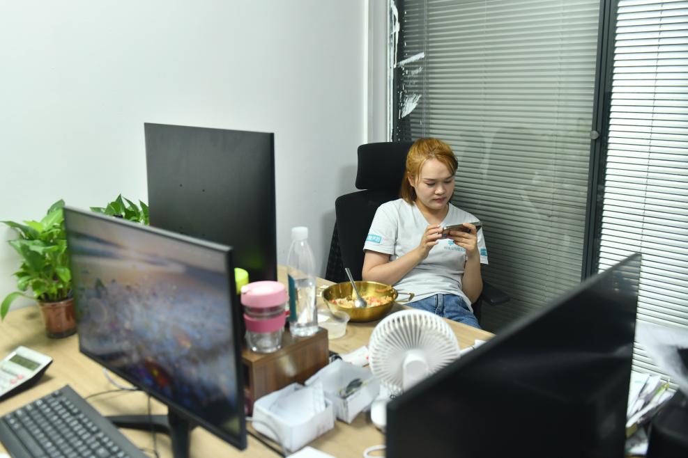 颜茜茜在公司办公室里休息(7月24日摄)。