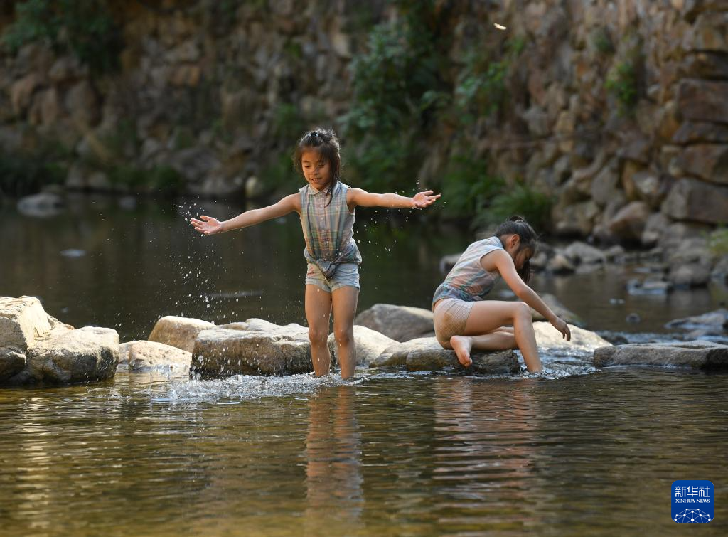7月17日,在松阳县松庄村,两名女孩在溪水中嬉戏。