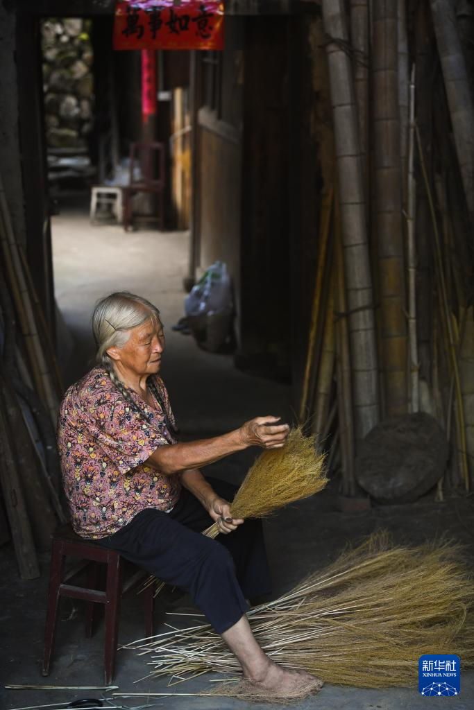 7月17日,在松阳县松庄村,村民叶金娟在家中编扫帚。