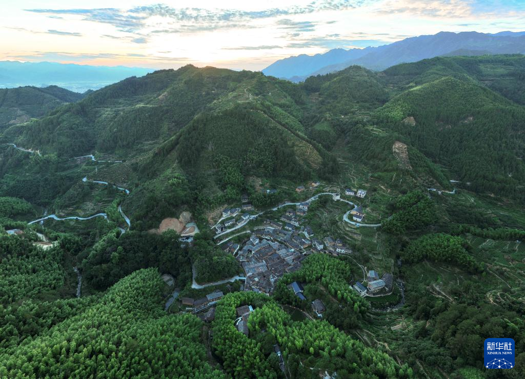 鸟瞰群山间的松庄村(无人机照片,7月17日摄)。