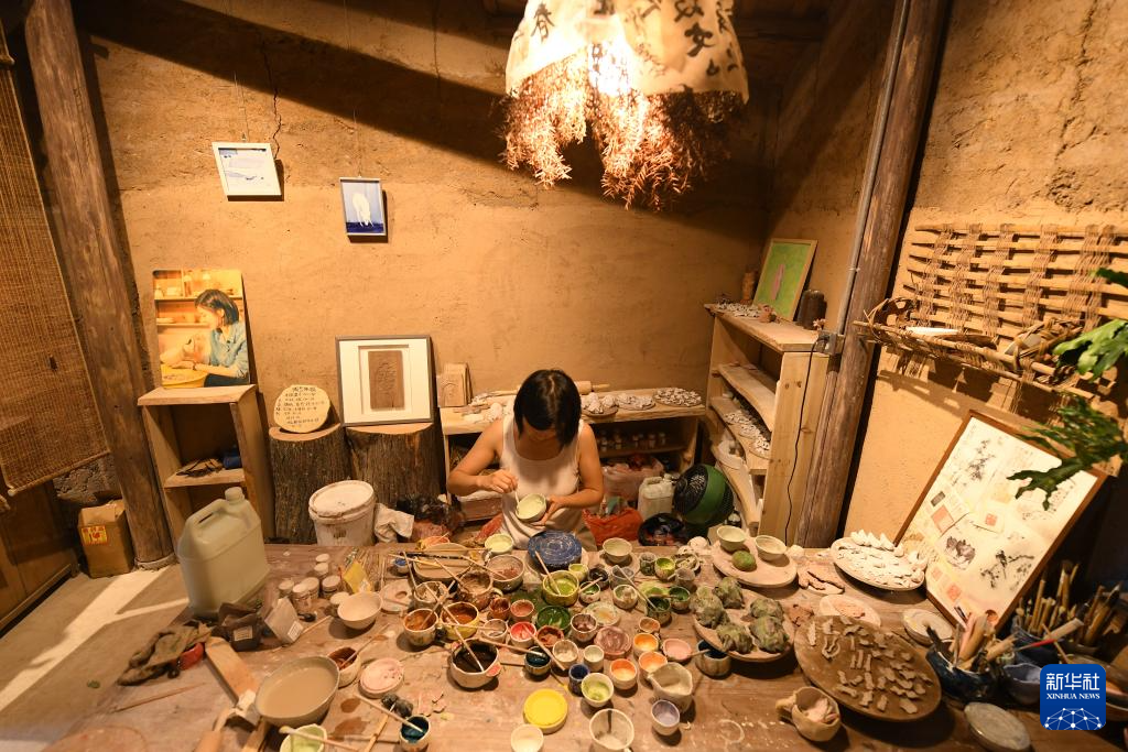 7月17日,在松阳县松庄村,来自河南的陶艺家何素素在自己的“诉土”陶艺工作室制作陶器。